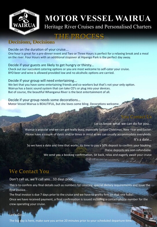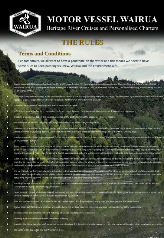 We require a Non-Refundable Deposit of 50% to make a booking, along with the completion of our Charter Cruise Agreement. The final balance is payable no less than 7 days prior for the cruise to proceed.