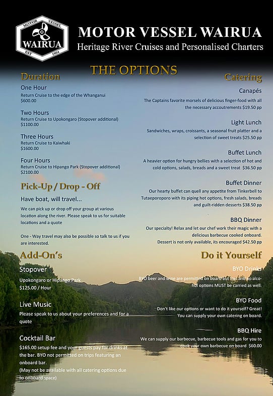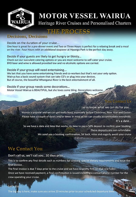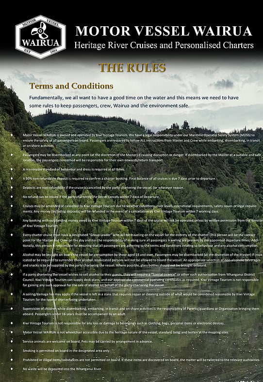 We require a Non-Refundable Deposit of 50% to make a booking, along with the completion of our Charter Cruise Agreement. The final balance is payable no less than 7 days prior for the cruise to proceed.
